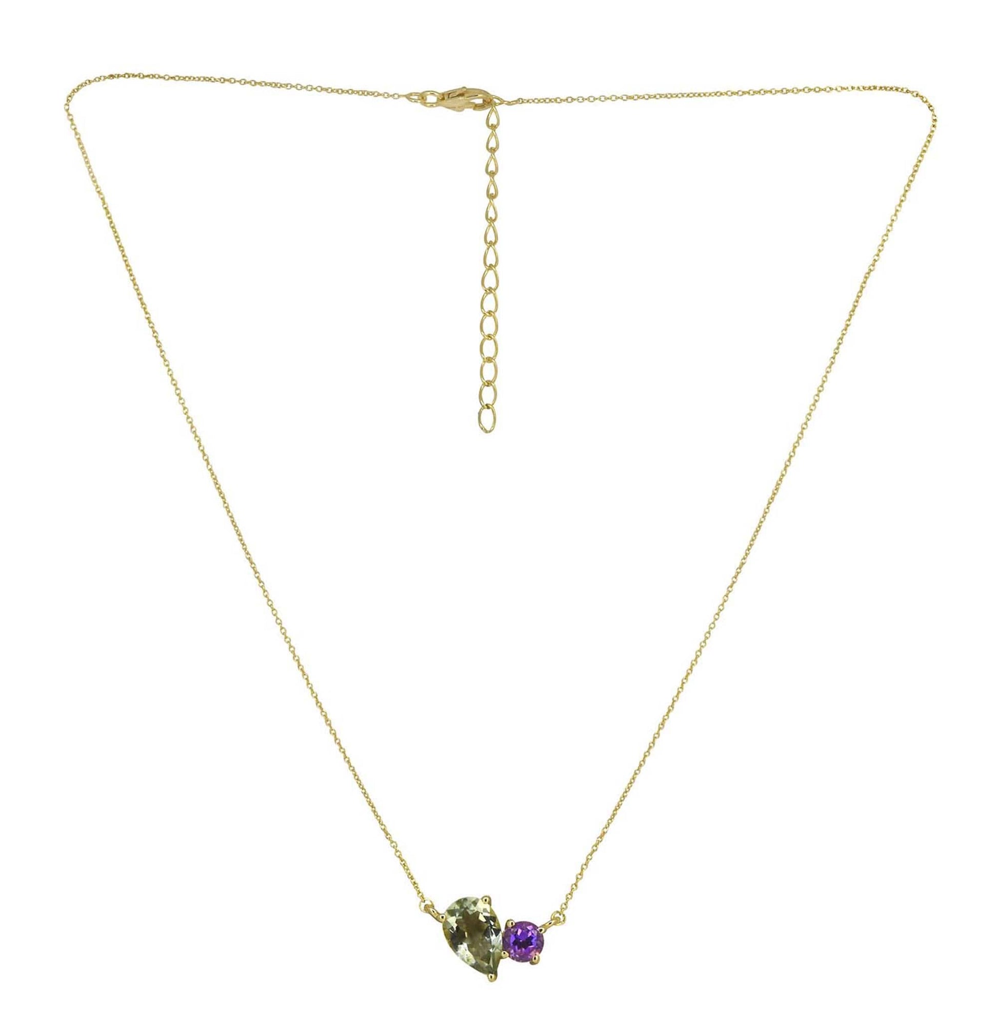 The necklace features a delicate gold plated over sterling silver chain with a clasp at the top. Suspended from the chain are two gemstones. One is a light green, teardrop-shaped green amethyst gemstone, and the other is a round, purple amethyst. The gemstones are close together, almost touching, and situated toward the center of the necklace.The clasp is a standard, gold-toned, detachable connector at the back.