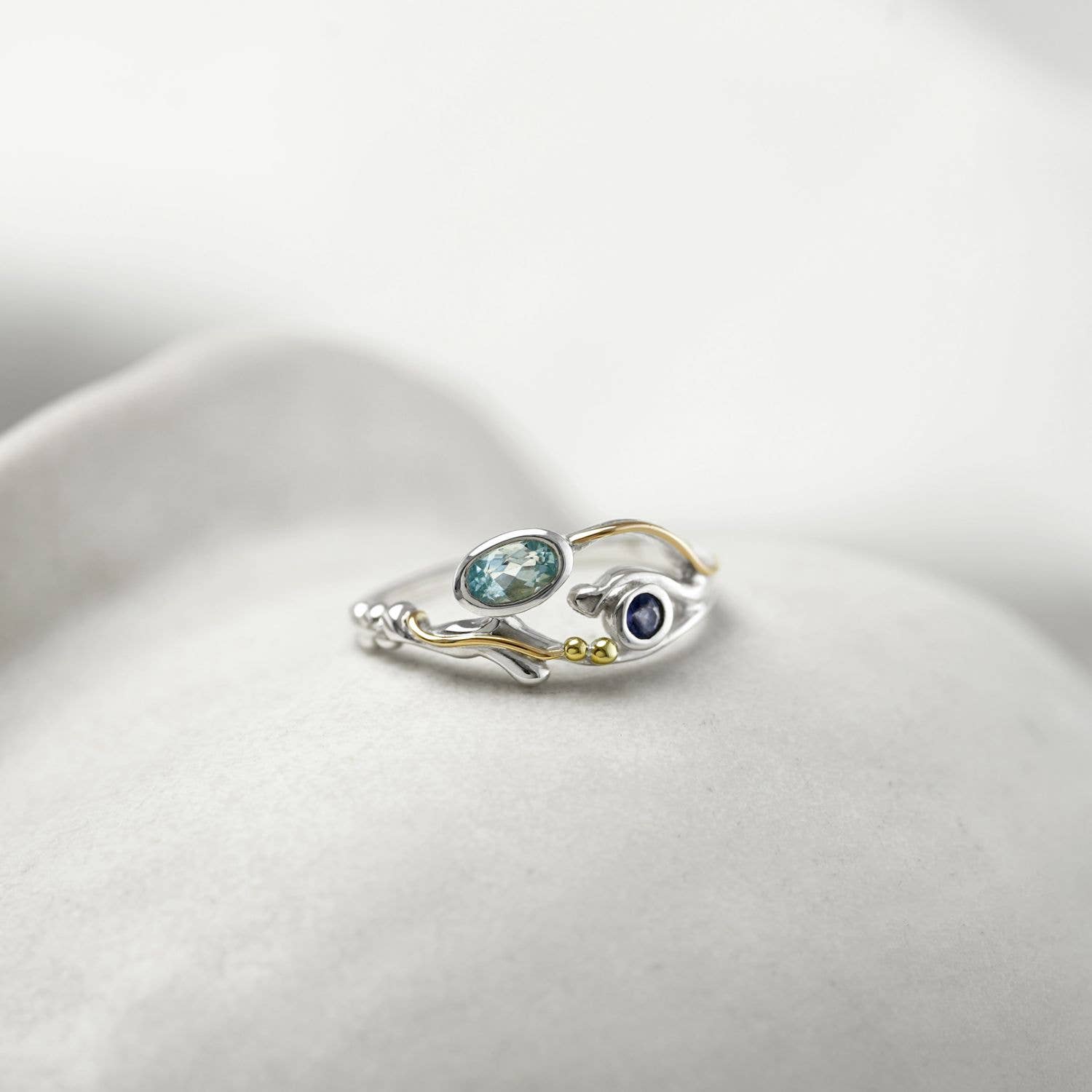 This ring features Blue Topaz and Iolite in a flowing design of Sterling Silver, with 14kt Gold and Brass details.